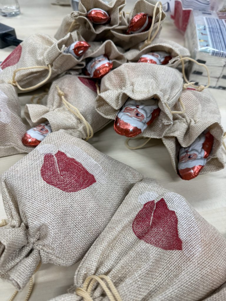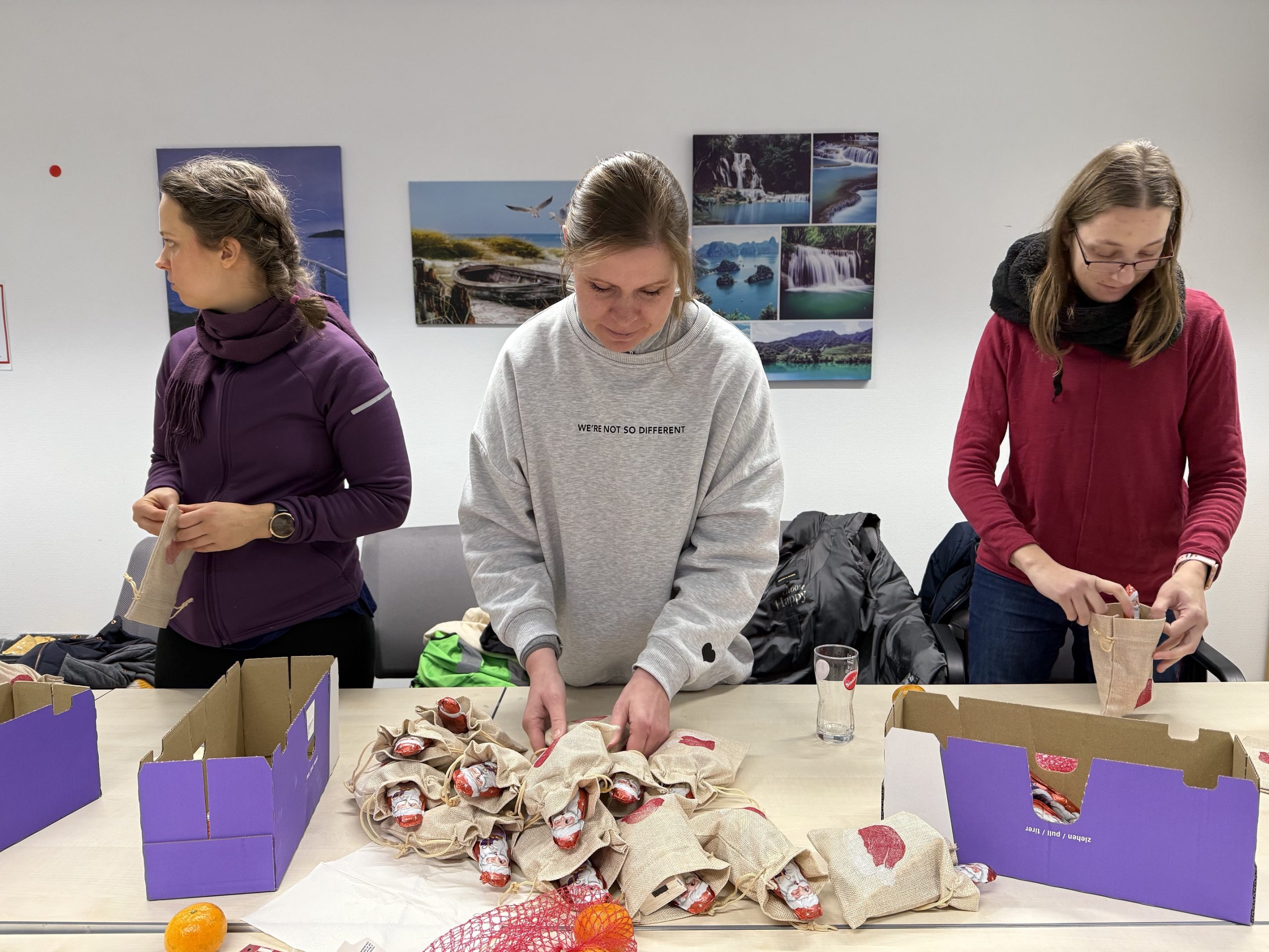 Gemeinsam mit unserem Kooperationspartner Stellwerk haben wir fünf Freiwilligen zunächst 100 Nikolausbeutel mit guten Gaben gefüllt – jeweils eine Mandarine für die Gesundheit, eine Packung Taschentücher für laufende Nasen, und einen Schokonikolaus für die Seele. Währenddessen haben uns die Streetworker einiges zum Thema Obdachlosigkeit und Drogensucht nahe gebracht.