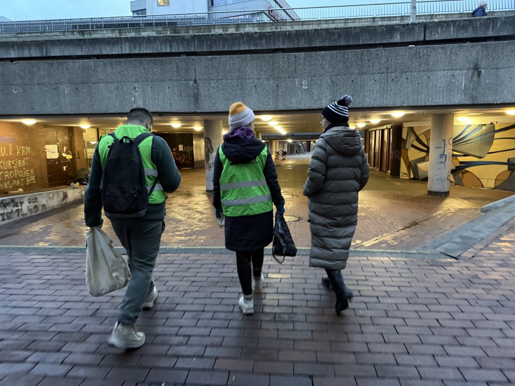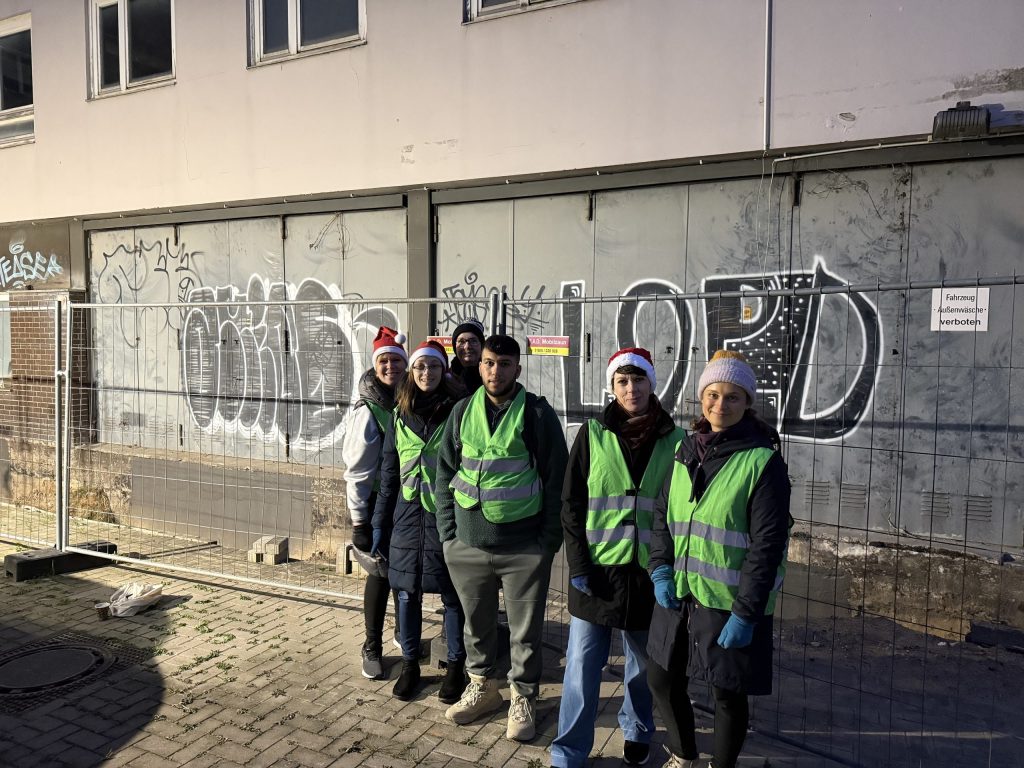 Wir treffen uns zunächst an der Sparkasse hinter dem Hauptbahnhof, gehen dann zu unserem Kooperationspartner Stellwerk. Während wir die Pakete füllen, bekommen wir eine kurze Einweisung in die Szene und ziehen dann los und verteilen unsere Gaben.